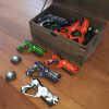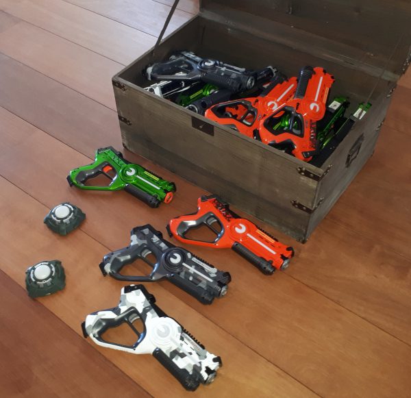 Bij ons huur je lasergamepistolen (met doelwit) voor € 5,70 per stuk per dag, verpakt in een oude munitiekist. Hoe langer je huurt, hoe hoger je korting.